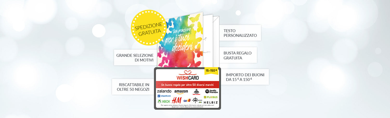 WISHCARD è il regalo perfetto per ogni occasione. WISHCARD è l'unico buono spendibile in oltre 50 shop online di marchi partner. Dalla A di Amazon alla Z di Zalando, chi riceve un buono regalo WISHCARD ha una scelta vastissima e chi regala WISHCARD fa la scelta giusta. WISHCARD è disponibile ora con diversi motivi augurali gratuiti, per varie occasioni come il Natale, un compleanno o un momento speciale. WISHCARD è disponibile nei tagli da 15, 25, 50, 100 e 150 €. La busta e la spedizione sono gratuite.